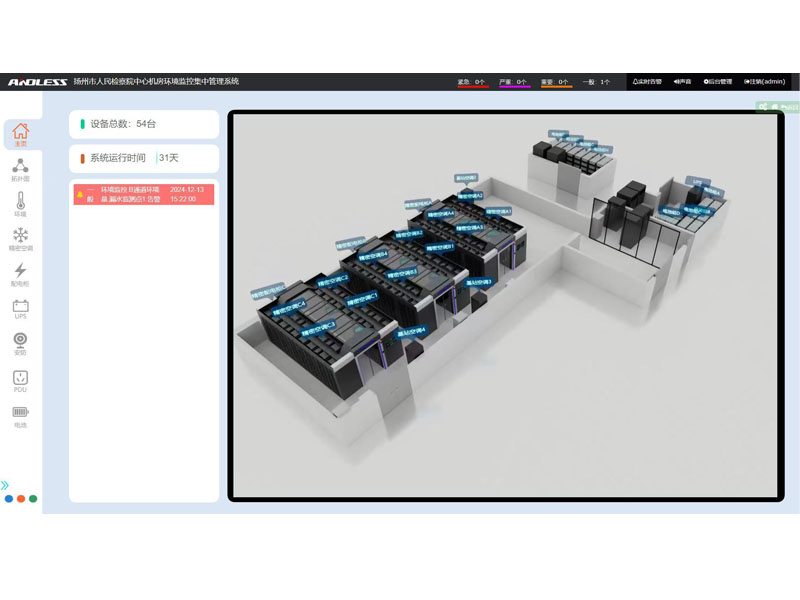 用戶介紹:       該檢察院為江蘇省揚州市境內的司法機關。 解決方案:      近期有幸為江蘇省某市檢察院提供三套安德力士品牌微模塊機房設備,涉及系統有:UPS不間斷電源、精密空調、機柜、配電、動力環境監控等系統;涉及主要設備有:UPS主機(30KVA、40KVA、300KVA)、鉛酸蓄電池(100AH64節、200AH128節、250AH320節)、精密空調(行級25KW12臺、基站12.5KW4臺)、機柜51套,現已全部安裝調試完成。      微模塊數據中心的主要優勢      1、快速部署、縮短建設周期      微模塊數據中心加快規劃與設計速度,可根據設計目標以合理的方式配置系統結構,微模塊批量生產可以實現現貨供應,因而提高了交貨速度;標準化的連接方式可減少現場配置與連接的工作量,加快安裝速度;微模塊數據中心建設周期可大大縮短,傳統數據中心實施階段需要7-8月,采用微模塊建設縮短至2-3個月。      2、方便擴展、分期建設      采用微模塊的架構,數據中心可以逐步增加,因而可使從1個微模塊到幾十個微模塊根據需求分期建設。微模塊數據中心方案顯著降低了數據中心在使用壽命期間的成本。      3、標準模塊、穩定可靠      微模塊數據中心采用模塊化、標準化和高整合設計,使得整個系統穩定度高。同時,微模塊數據中心可依據客戶需求,在電力備援方案上提供N、N+1、2N等配置方案。      4、綠色、節能          數據中心在使用壽命期間的電力成本是TC(總擁有成本)中的一項。相比傳統機房,微模塊數據中心制冷效率提升。微模塊數據中心結合水冷系統、自然冷卻系統,PUE降低。      5、智能管理、高效運營      智能的管理系統能夠幫助客戶節能降耗,實現數據機房多層級、精細化能耗管理,通過多種報表精確定位能源額外損耗點?;诖髷祿治?,輸出節能優化方案,構建綠色數據機房。資產管理是對于全網資產的生命周期進行管理實現資產信息的閉環管理,保證數據及時刷新,及時管理。同時幫助用戶制定資產維護計劃,在維護計劃內幫助客戶實現主動預警,同時可動態調整維護計劃,按照當前實際情況輸出優化方案,構建資產管理功能。
